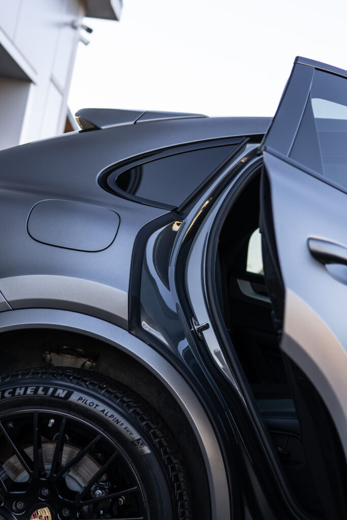 Zastosowana satynowa folia ochronna PPF klasy premium skutecznie zabezpiecza lakier przed odpryskami kamieni, mikrozarysowaniami, solą drogową, chemią oraz promieniowaniem UV. Dzięki technologii samoregeneracji drobne rysy znikają pod wpływem ciepła, a powierzchnia zachowuje perfekcyjny wygląd przez długie lata. Satynowe wykończenie subtelnie matowi lakier, podkreślając muskularną linię Cayenne i nadając mu nowoczesny, sportowy styl.